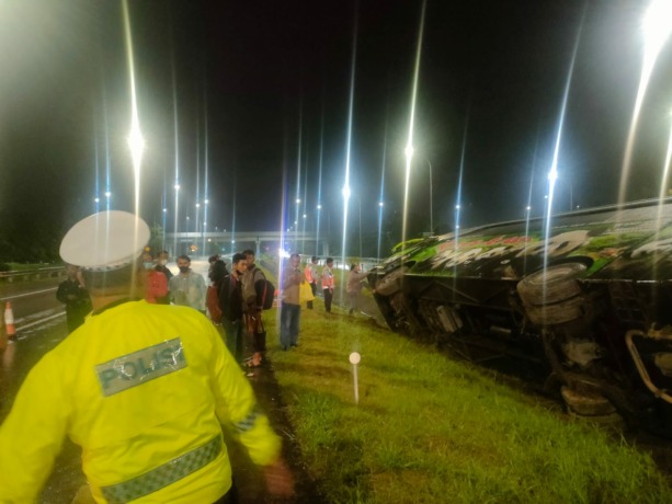 KECELAKAAN tunggal menimpa bus Restu jurusan Madiun-Surabaya di ruas tol Jombang-Mojokerto (Jomo), tepatnya di KM 707, Desa/Kecamatan Gedeg, Jumat (3/3) dini hari. Bus dengan 12 penumpang ini terguling di median tol usai terseok-seok sendiri saat melaju menuju arah Surabaya. Beruntung, tidak ada korban jiwa dalam peristiwa tersebut.