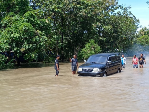 JALAN raya, pertokoan, fasilitas umum, dan rumah warga di Desa Modongan, Kecamatan Sooko, terendam banjir, kemarin (22/3). Tak sedikit kendaraan yang nekat menerabas jalur alternatif Mojokerto-Jombang itu mengalami mogok. Banjir langganan ini terjadi akibat meluapnya saluran air sepanjang jalan.