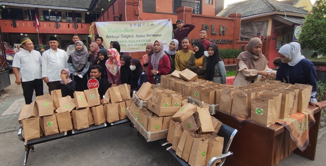 PULUHAN anggota Saka Kalpataru Kota Mojokerto bagikan takjil Jelang waktu berbuka puasa. Takjil dibagikan kepada pengendara yang melintas di depan kantor Dinas Lingkungan Hidup jaln Rafen Wijaya Kota Mojokerto, Sabtu (15/4) sore.