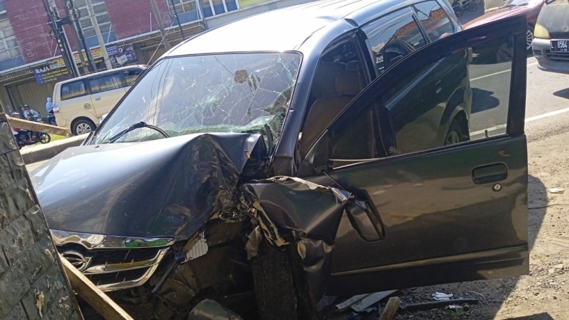 KECELAKAAN tunggal menimpa sekeluarga asal Gresik saat melintas di jalan raya Bypass, tepatnya di Desa Brangkal, Kecamatan Sooko, Kabupaten Mojokerto, Minggu (23/4) siang. Enam penumpang harus dilarikan ke Rumah Sakit Dian Husada, Sooko usai mobil Daihatsu Xenia yang mereka tumpangi menabrak tembok depan kampus Sekolah Tinggi Ilmu Ekonomi (STIE) Al Anwar.