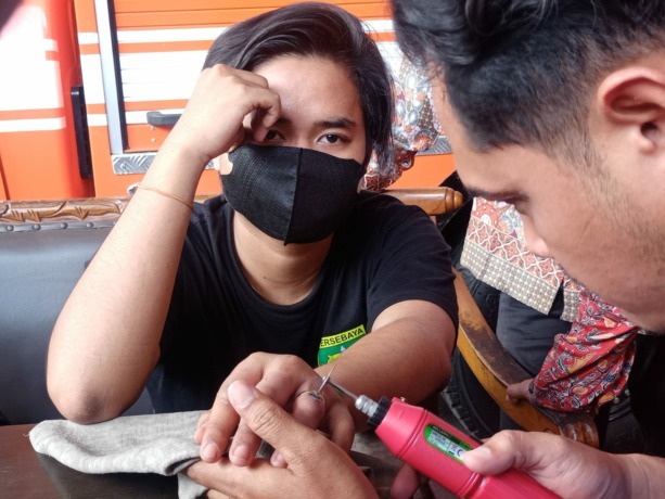 DAMKAR Kabupaten Mojokerto melakukan operasi pemotongan cincin yang tersangkut di jari Rizky Wahyu Firmansyah, 23, karyawan percetakan kertas asal Dusun Adisono, Desa Lebaksono, Kecamatan Pungging, Kamis (27/4) siang. Cincin monel itu tak bisa dilepas usai jari korban terjepit pada mesin printing.