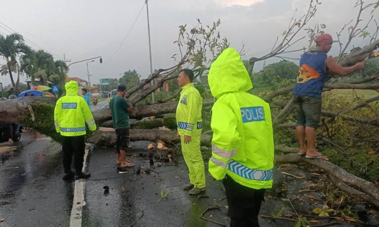 ANGIN kencang masih menerjang sejumlah area di Kabupaten Mojokerto. Kemarin, pohon randu di pinggir Jalan Raya Desa Padi, Kecamatan Gondang, roboh usai diterjang angin kencang. Meski tak ada korban jiwa, namun robohnya pohon berdiameter 50 sentimeter itu membuat lalu lintas dari dan menuju kawasan wisata Pacet tersendat.