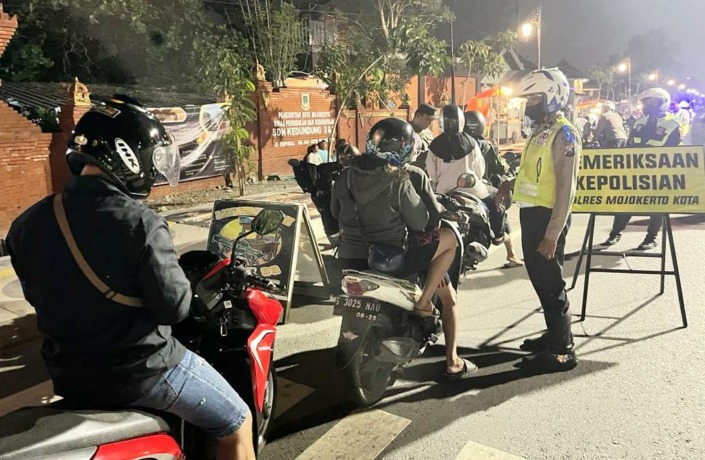 PULUHAN pengendara motor terjaring razia di simpang empat Jalan Empunala, Kota Mojokerto, Selasa (6/6) malam. Sebanyak 12 unit motor, 29 STNK, dan 5 SIM disita polisi. Razia tersebut menyasar pengguna knalpot brong dan pelanggar lalu lintas kasat mata.